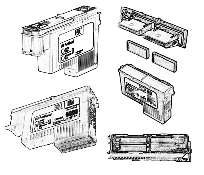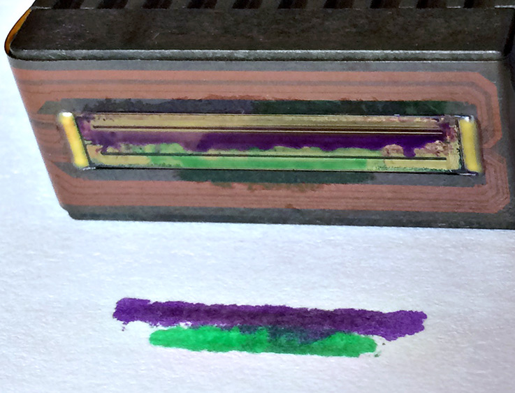 (Above), closeup of HP 70 printhead showing the two sides, or double heads