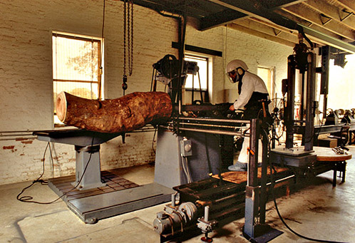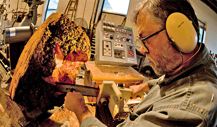 Mark Lindquist sculpting wood being held and positioned by his robot